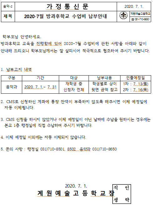 (À½¾Ç°ú)2020-7¿ù ¹æ°úÈÄÇб³ ¼ö¾÷ºñ ³³ºÎ ¾È³»