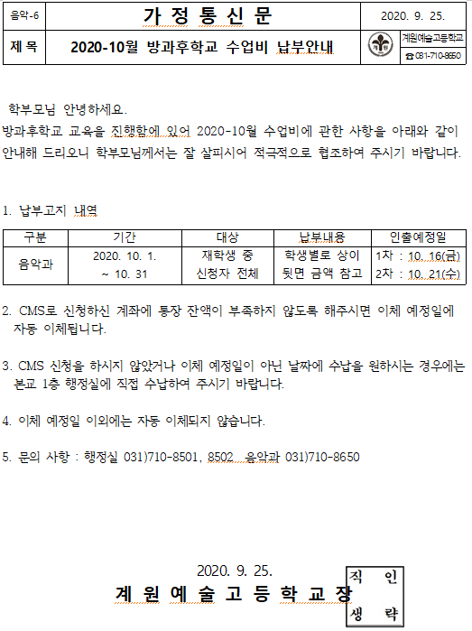 (À½¾Ç°ú)2020-10¿ù ¹æ°úÈÄÇб³ ¼ö¾÷ºñ ³³ºÎ ¾È³»